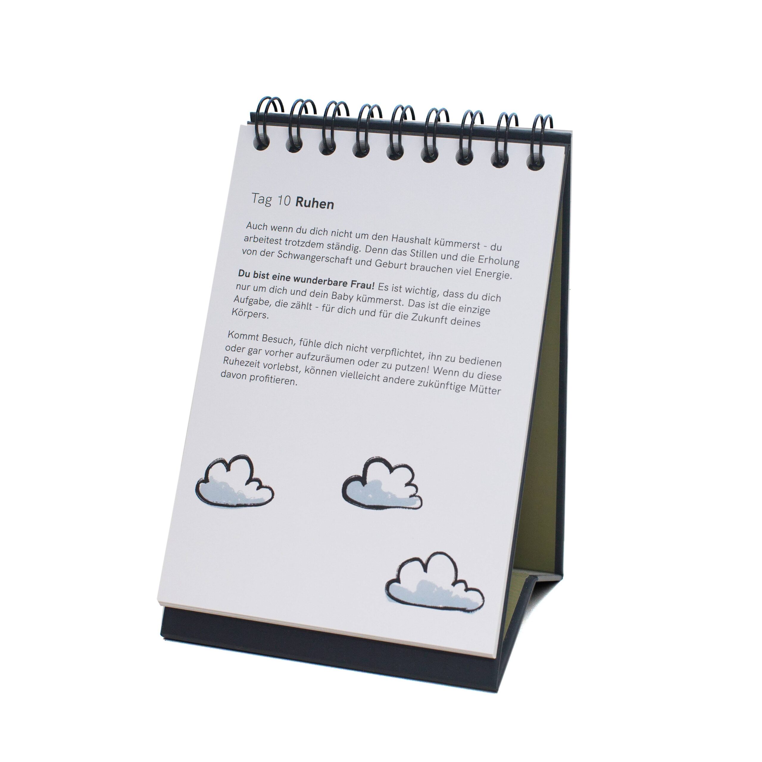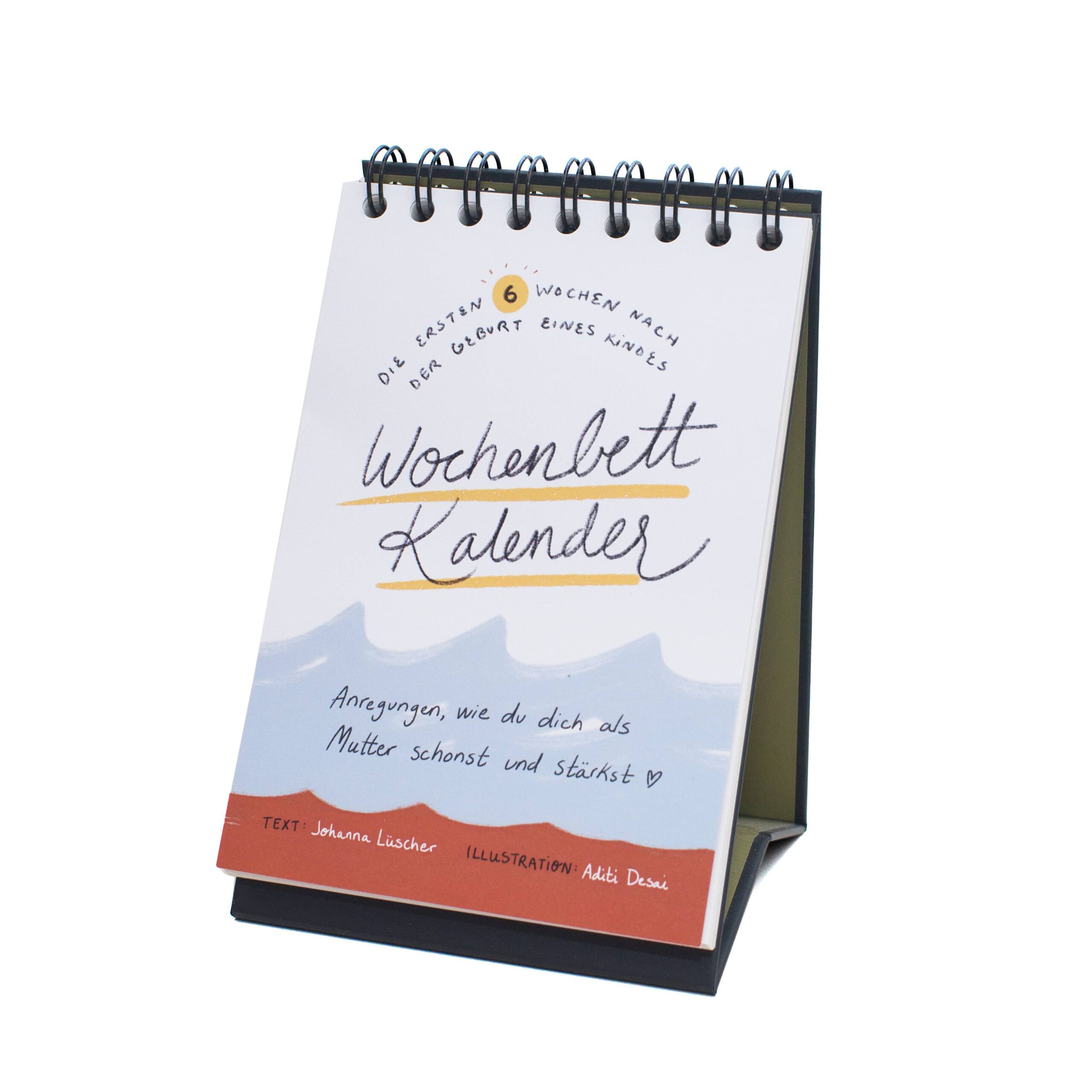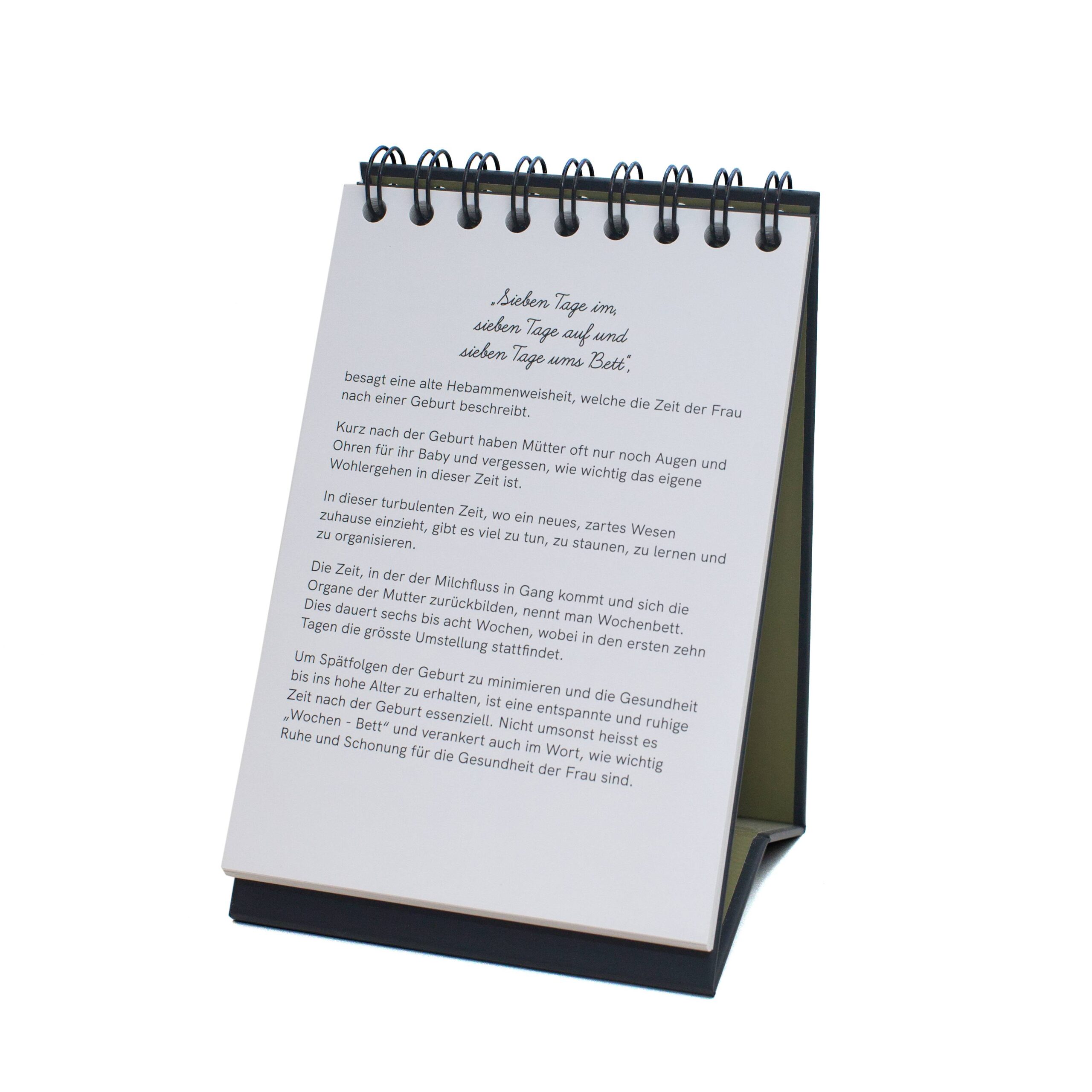 Der Kalender ist von einer Hebamme entwickelt worden und enthält einfache Körperübungen, Rezepte und Denkanstösse für die ersten sechs Wochen nach der Geburt.