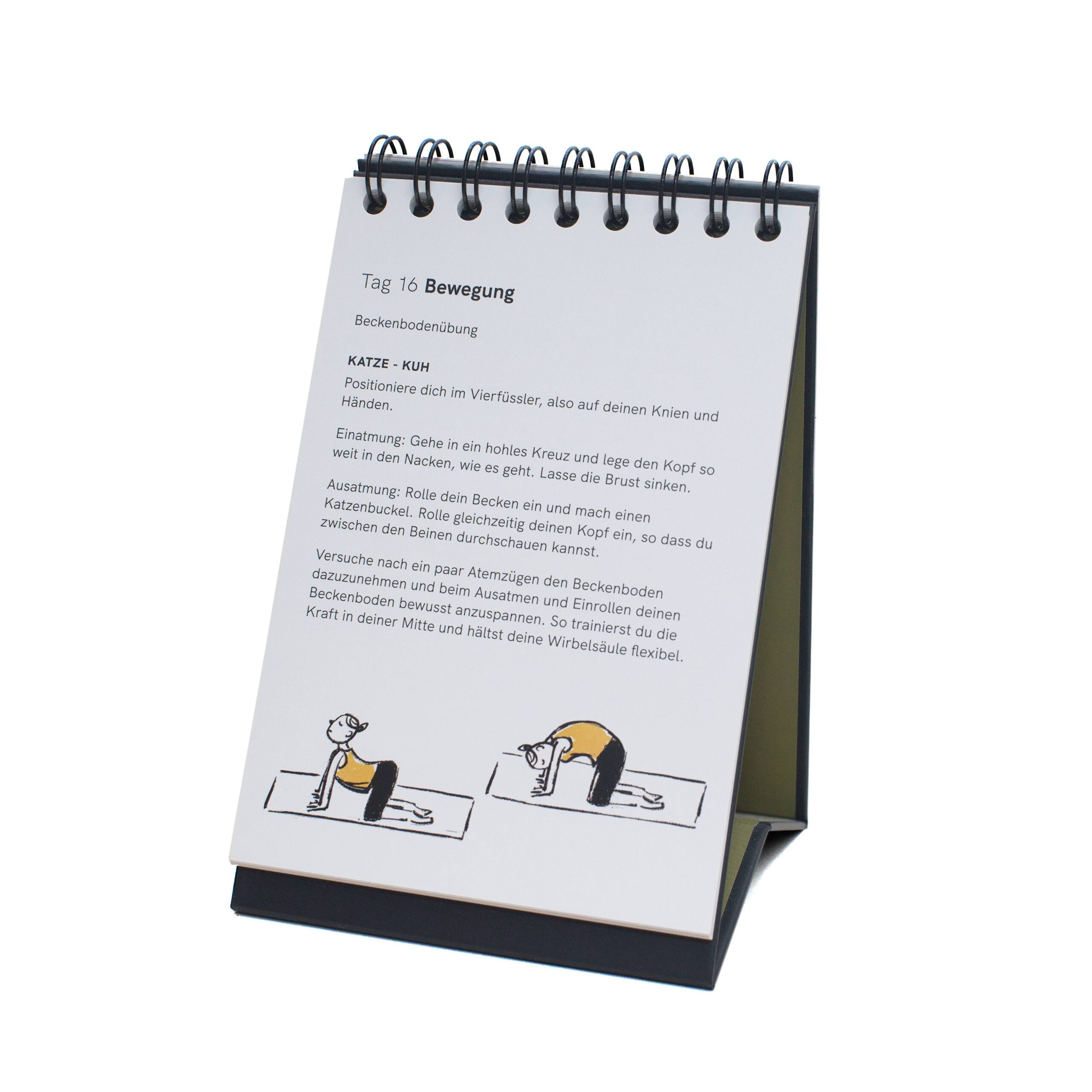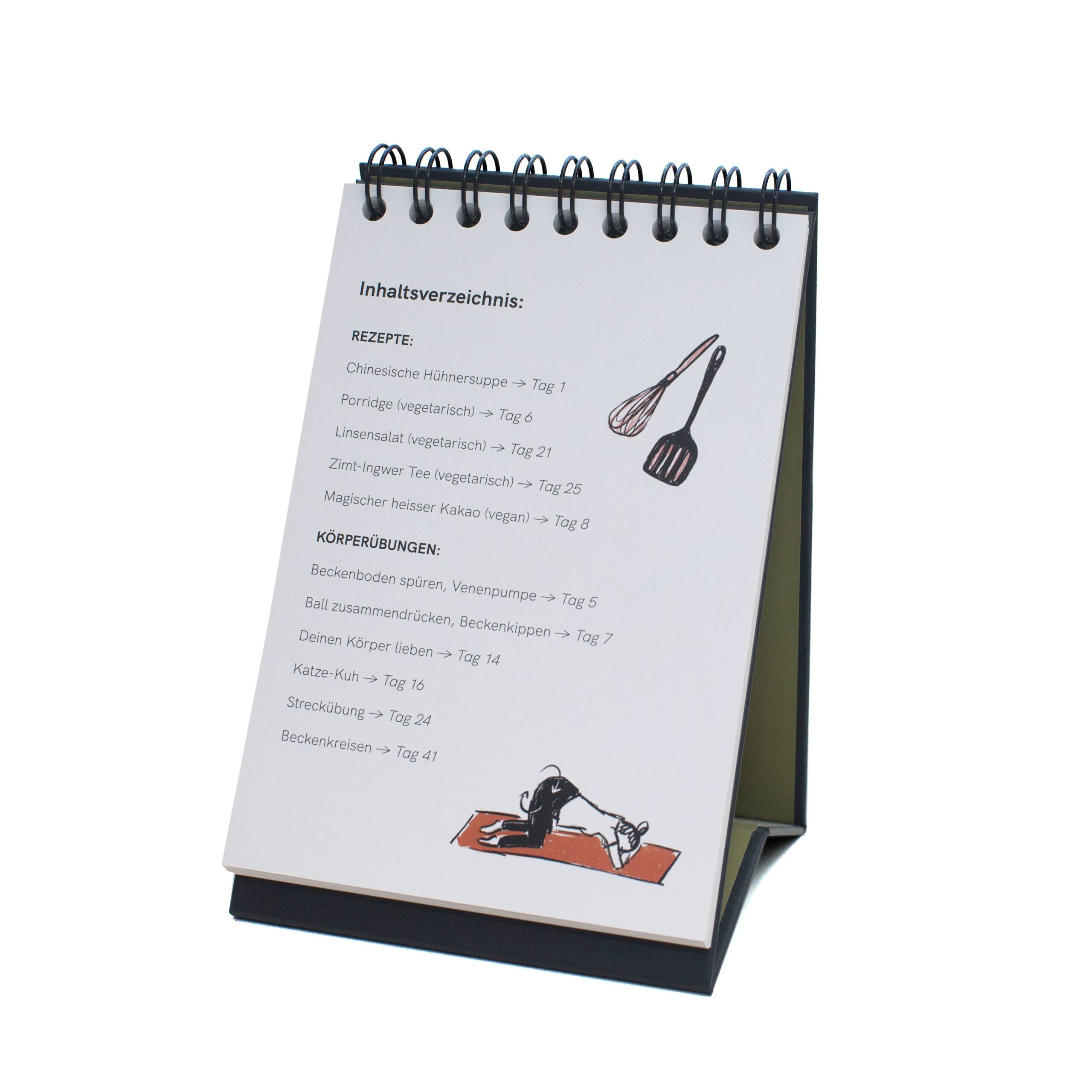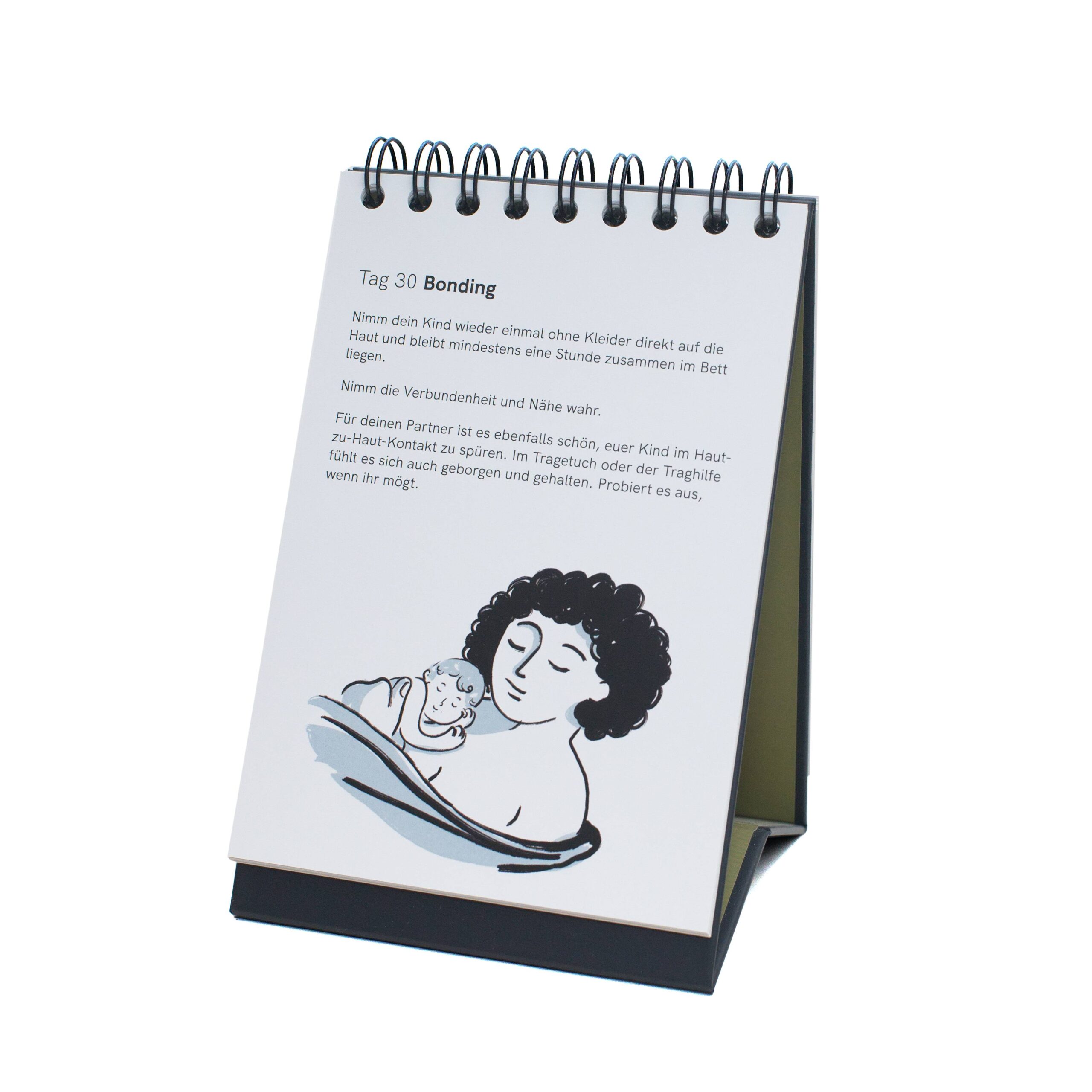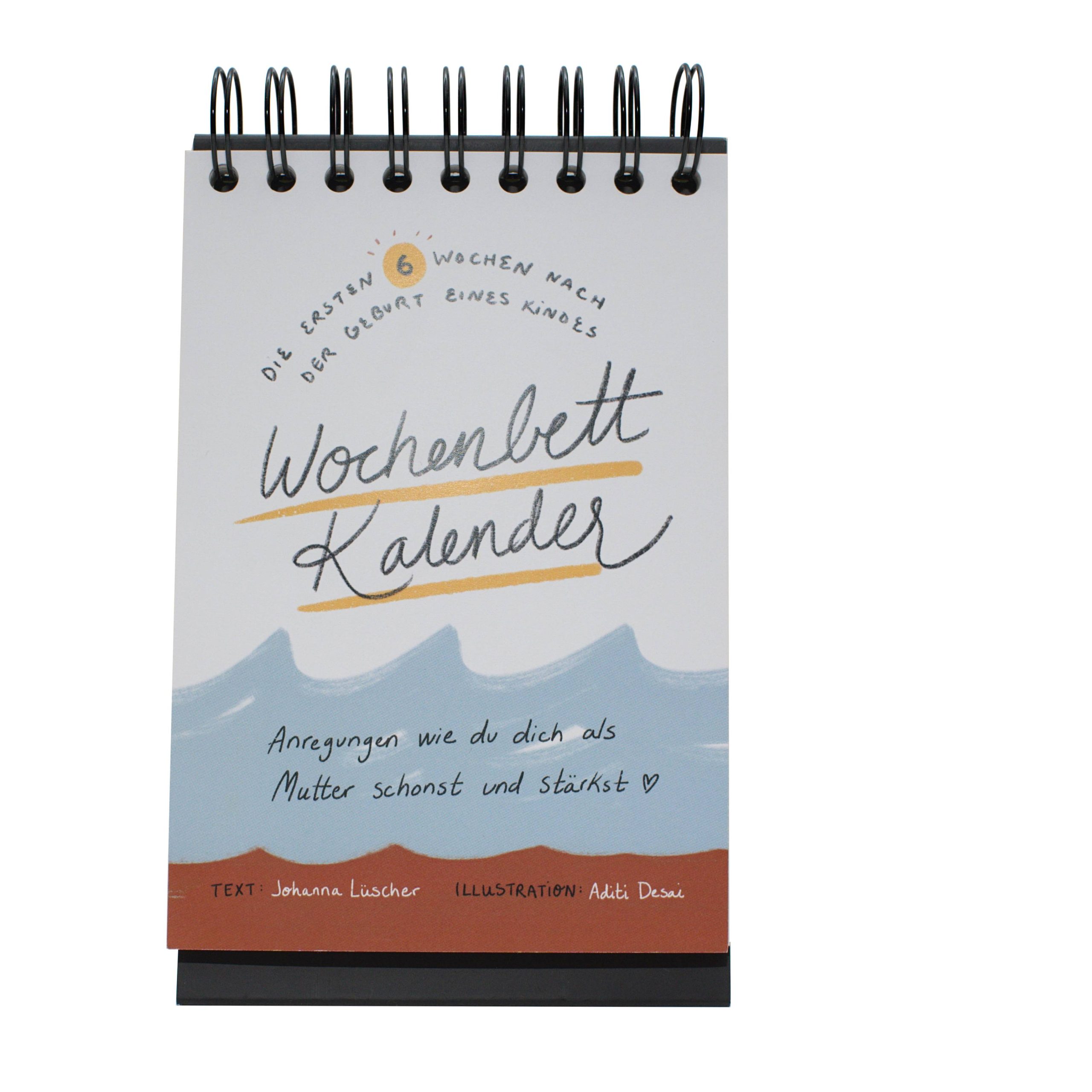 Der Kalender ist von einer Hebamme entwickelt worden und enthält einfache Körperübungen, Rezepte und Denkanstösse für die ersten sechs Wochen nach der Geburt.